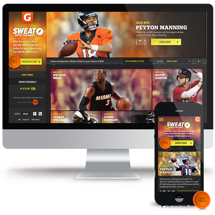 Gatorade wanted to celebrate it’s 50th Anniversary with a HUGE sweepstakes. It had to be 50 prizes of something.. so why not 50 experiences with Gatorade Athletes!? With a typical Under-the-Cap promotional framework, we needed a website that captured the excitement, essence and breadth of all the Athlete amazingness. Sweat With the Best.