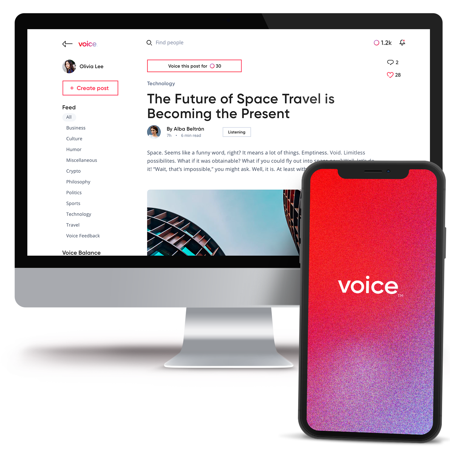 The feed of Voice attempted to stay bright and modern, letting the content shine uncompetitively with the app itself. As a more stripped down MVP experience, users could still easily jump into several categories of content, later to be replaced by a robust search. Users also had quick highlights of article-performance and opportunities to participate in "Voice it" - our in-app incentivization model.